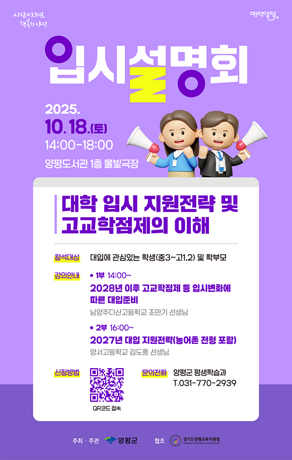 [아이뉴스24 이윤 기자] 경기도 양평군은 오는 18일 양평도서관 물빛극장에서 관내 학생과 학부모를 대상으로 ‘2025년 양평군 대학 입시설명회’를 개최한다.