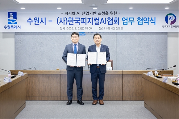 [아이뉴스24 김정수 기자] 경기도 수원특례시와 (사)한국피지컬에이아이(AI)협회는 지난 6일 시청 상황실에서 업무협약을 체결하고, 피지컬 인공지능(AI) 산업 활성화를 위해 적극적으로 협력하기로 했다고 9일 밝혔다.