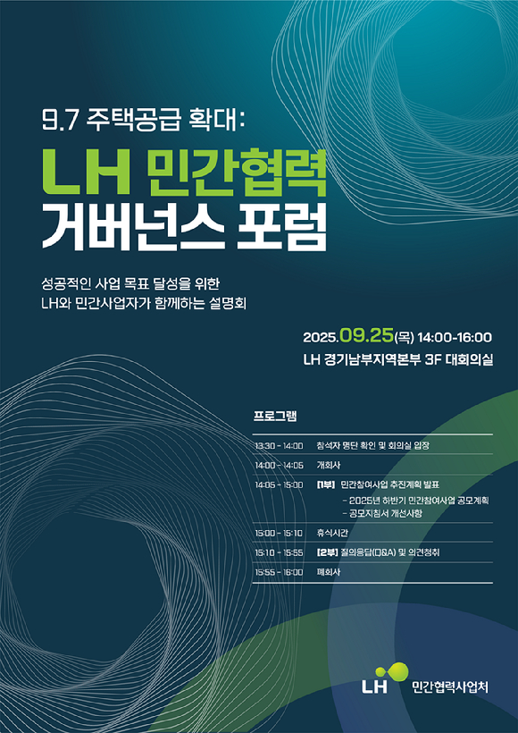 [아이뉴스24 이수현 기자] 한국토지주택공사(LH)는 25일 LH 경기남부지역본부 3층 대회의실에서 ‘LH 민간협력 거버넌스 포럼’을 개최한다고 밝혔다.
